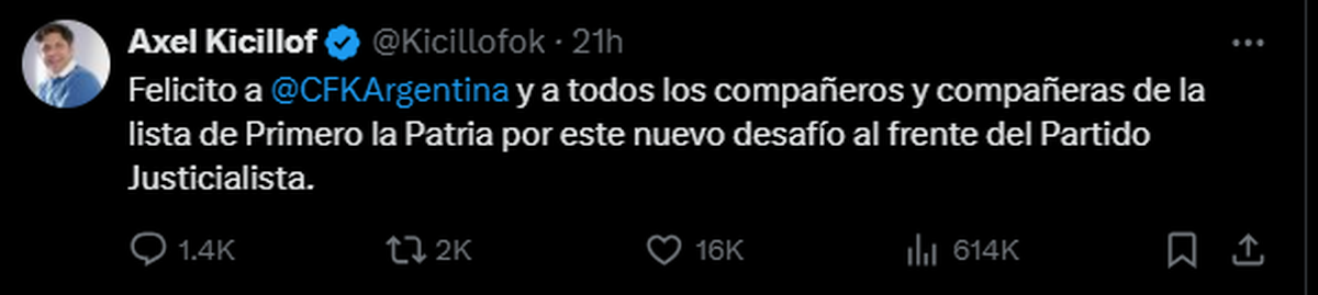 Entre tantas idas, vueltas, acercamientos y alejamientos entre Axel y Cristina, este martes Kicillof felicitó a la ex mandataria.