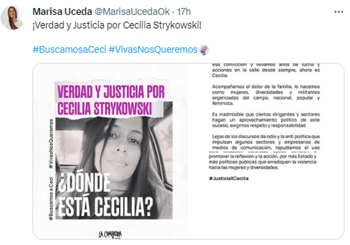 También se manifestó, pero en las redes sociales, la abogada y diputada nacional Marisa Uceda, quien pidió "Verdad y Justicia por Celia Strykowski.