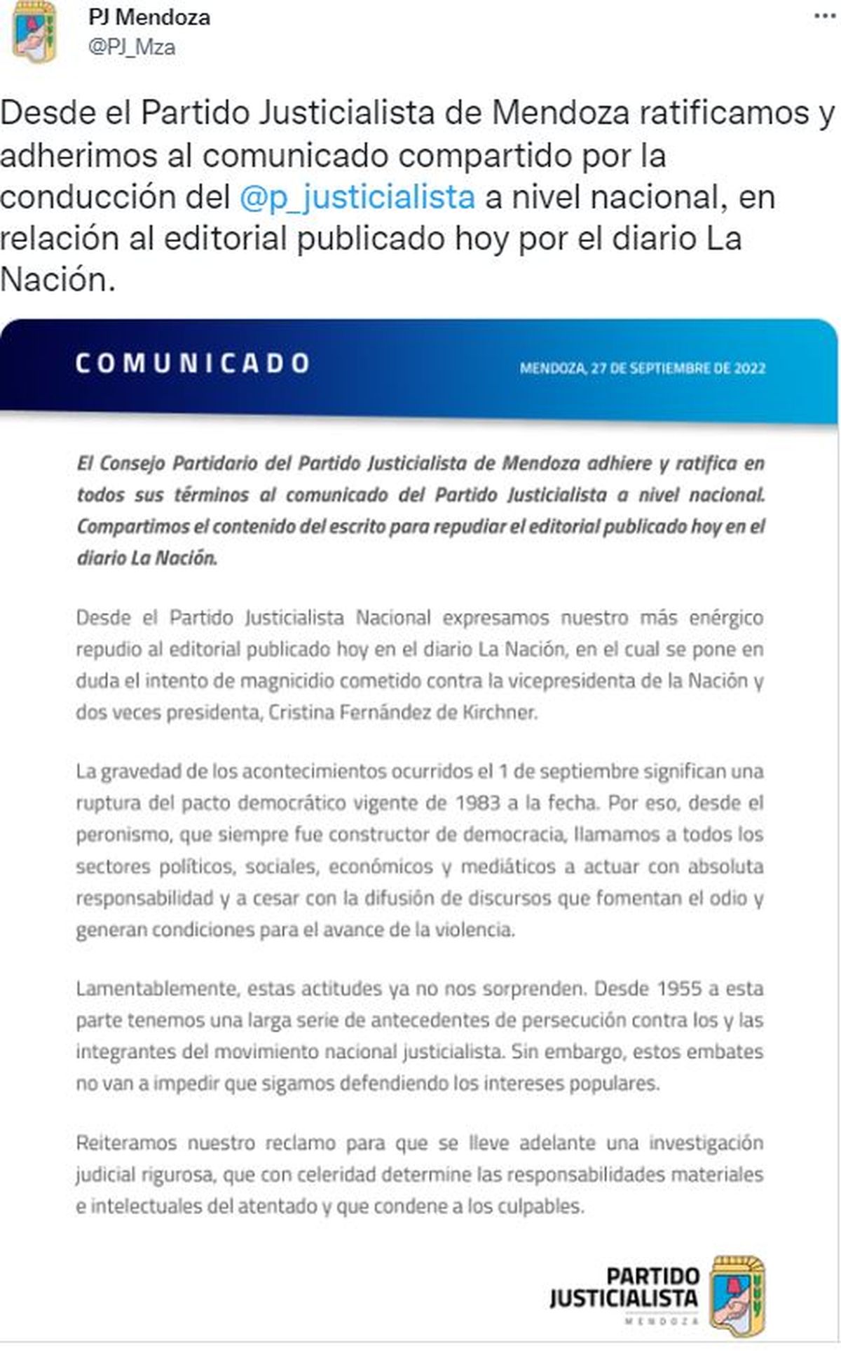 El propio Partido Justicialista emitió un comunicado de repudio en el que afirma: "Desde el PJ Nacional expresamos nuestro más enérgico repudio al editorial publicado hoy (por este martes) en el diario La Nación, en el cual se pone en duda el intento de magnicidio cometido contra la vicepresidenta de la Nación y dos veces presidenta, Cristina Fernández de Kirchner".