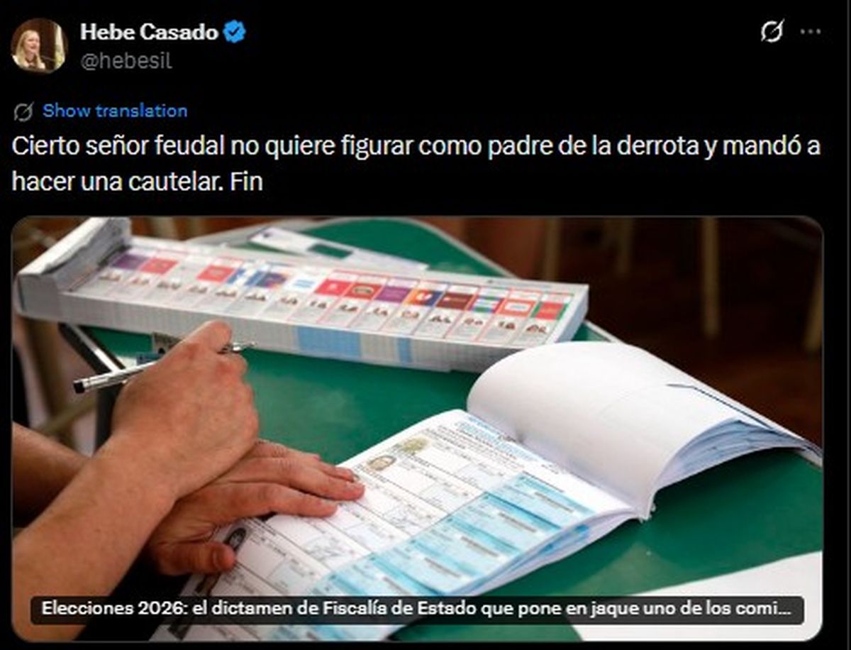 "Cierto señor feudal no quiere figurar como padre de la derrota y mandó a hacer una cautelar. Fin", posteó Hebe Casado hace unas horas a través de su cuenta de X, ex Twitter.