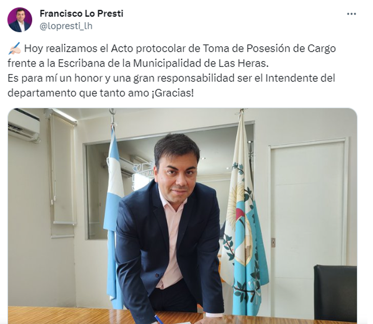 A través de la red social X, Lo Presti, quien se había desempeñado como secretario de Obras Públicas de Daniel Orozco, publicó una foto del acto protocolar que se realizó este domingo frente a la escribanía de la Municipalidad de Las Heras.