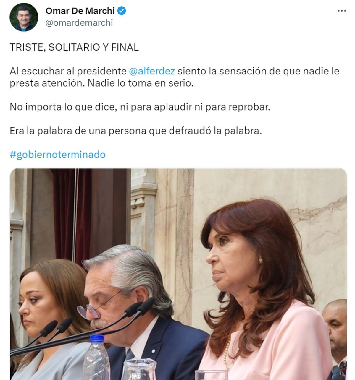 Uno de los referentes del PRO en Mendoza, Omar De Marchi, quien todavía no decide si continuará dentro de Cambia Mendoza en las elecciones 2023, también apuntó contra Alberto. "Triste, solitario y final. Al escuchar al Presidente siento la sensación de que nadie le presta atención. Nadie lo toma en serio. No importa lo que dice, ni para aplaudir ni para reprobar. Era la palabra de una persona que defraudó la palabra. #gobiernoterminado".