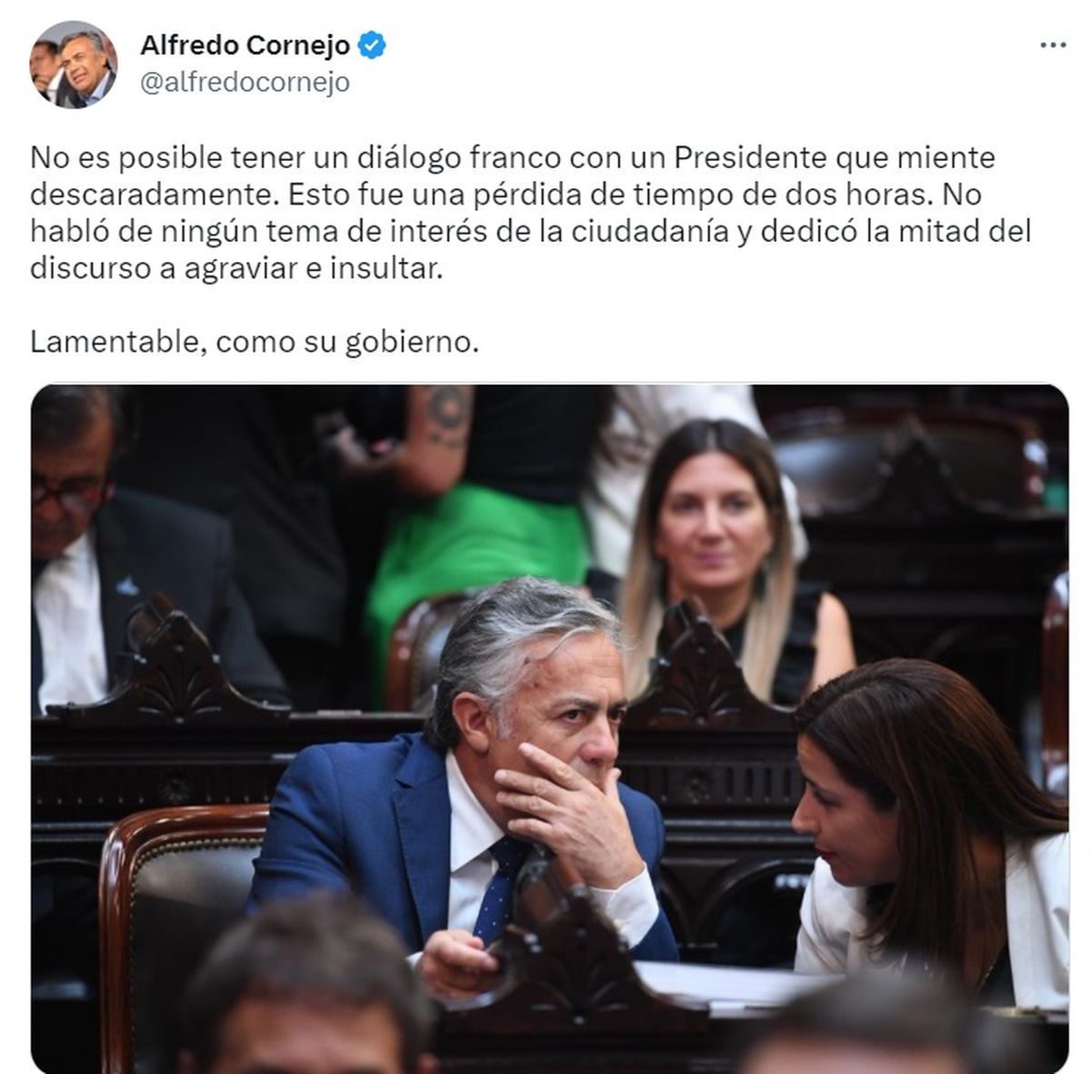 En tanto, el actual precandidato a gobernador radical posteó: "No es posible tener un diálogo franco con un Presidente que miente descaradamente. Esto fue una pérdida de tiempo de dos horas. No habló de ningún tema de interés de la ciudadanía y dedicó la mitad del discurso a agraviar e insultar. Lamentable, como su gobierno".