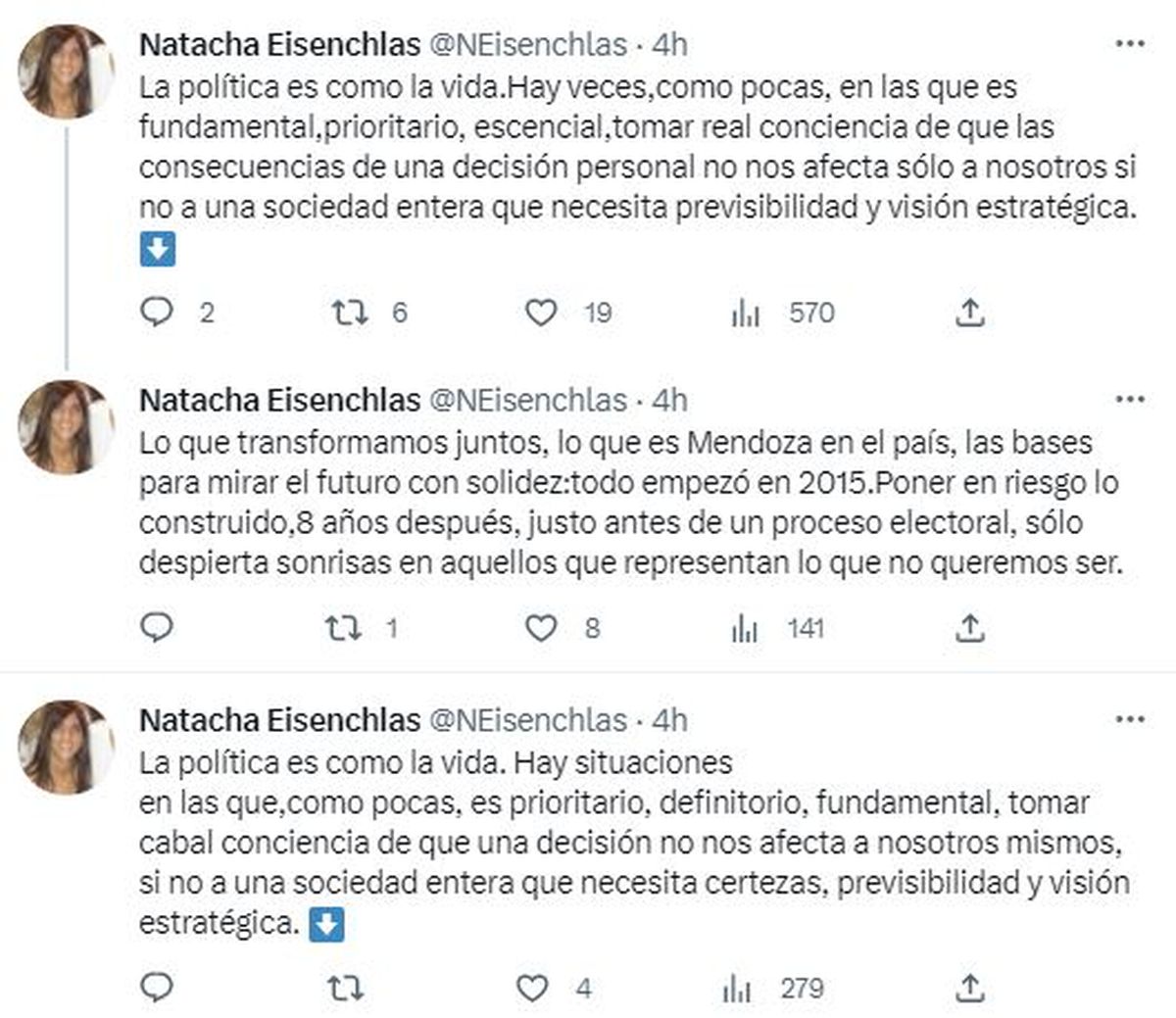 La presidenta provisonal del senado, Natacha Eisenchlas, fue de las primeras de la UCR en cuestionar a la conducción del PRO a la que acusó de poner en riesgo a la alianza gobernante: "Lo que transformamos juntos, lo que es Mendoza en el país, las bases para mirar el futuro con solidez: todo empezó en 2015. Poner en riesgo lo construido,8 años después, justo antes de un proceso electoral, sólo despierta sonrisas en aquellos que representan lo que no queremos ser".