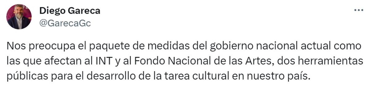También en sus redes sociales se había expresado el subsecretario de Cultura local: "Nos preocupa el paquete de medidas del gobierno nacional actual como las que afectan al INT y al Fondo Nacional de las Artes, dos herramientas públicas para el desarrollo de la tarea cultural en nuestro país", escribió en su cuenta de X.