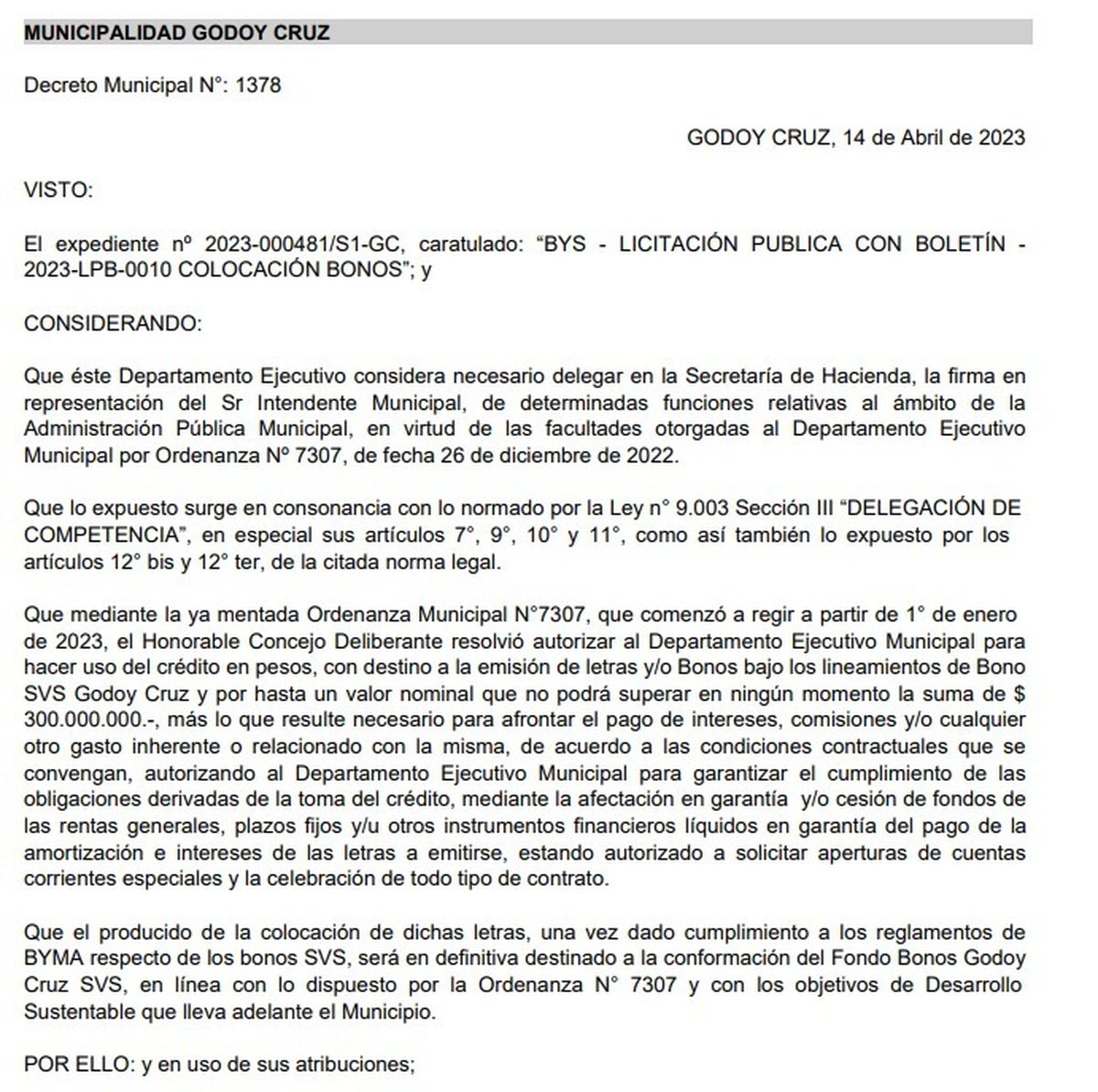 El intendente de Godoy Cruz, Tadeo García Zalazar, emitirá "bonos verdes" por $300 millones y los destinará ampliar un parque solar y a equipar ecocasas con calefones solares y energías alternativas. En principio, según lo que se publicó este miércoles en el Boletín Oficial, esa toma de deuda pública vencería a fines de noviembre, es decir que se debería pagar antes de que termine esta gestión.