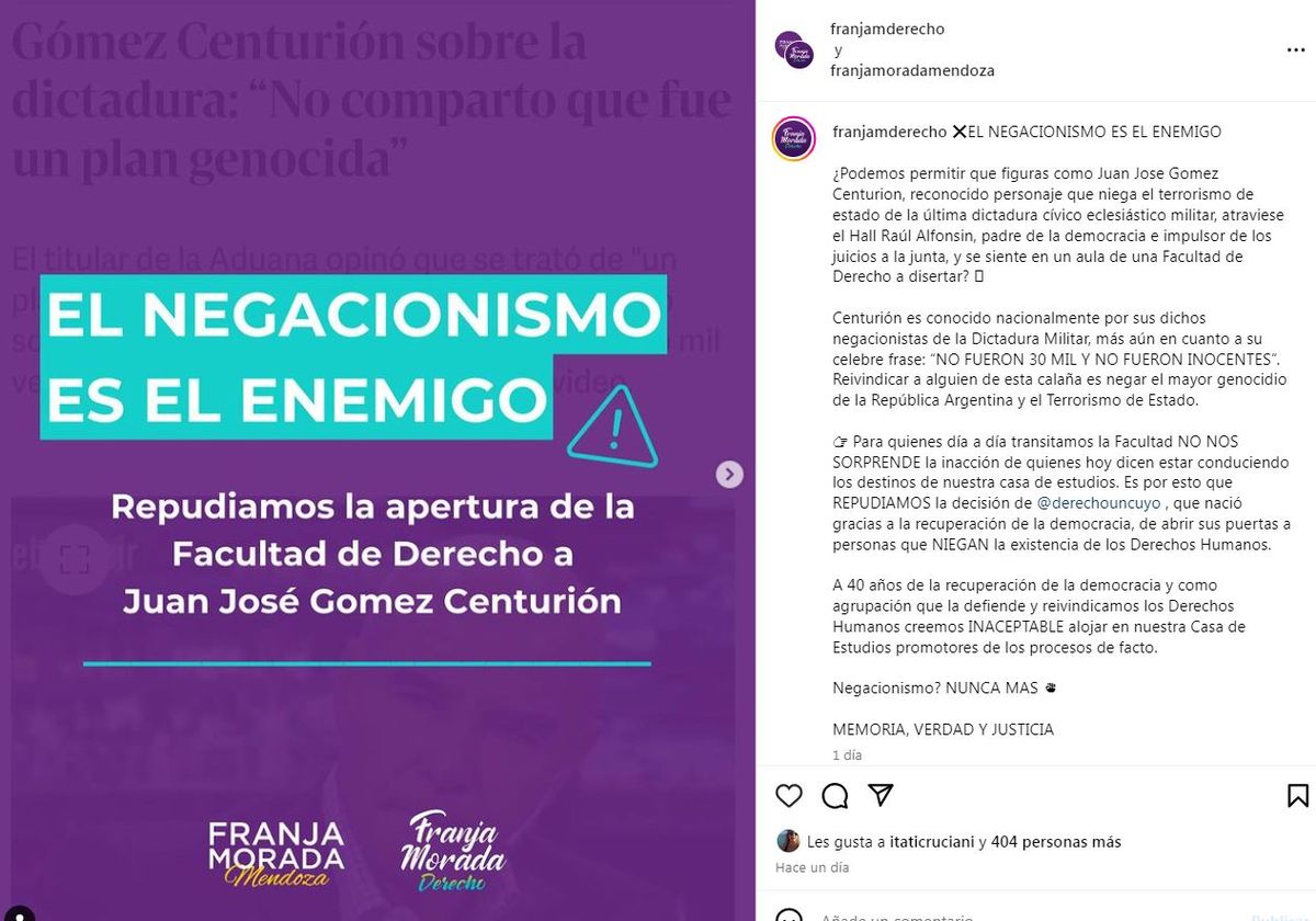 "¿Podemos permitir que figuras como Juan Jose Gomez Centurion, reconocido personaje que niega el terrorismo de Estado de la última dictadura cívico eclesiástico militar, atraviese el hall Raúl Alfonsin, padre de la democracia e impulsor de los juicios a la junta, y se siente en un aula de una Facultad de Derecho a disertar?", dice un comunicado de Franja Morada.