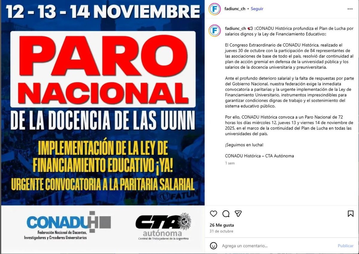 Los gremios docentes de las universidades nacionales convocaron a un paro de 72 horas a partir del miércoles, en reclamo de que el gobierno nacional aplique la Ley de Financiamiento Educativo , sancionada por el Congreso el 21 de octubre.