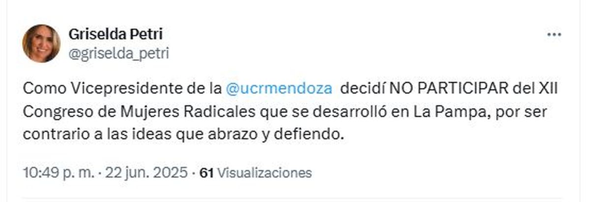 Si hacía falta un gesto más que mostrara la alineación de los hermanos Petri con el Gobierno Nacional, ese se dio este fin de sermana, cuando Griselda Petri, vicepresidenta de la UCR de Mendoza, pegó el faltazo al Congreso de Mujeres del partido. La sanmartiniana fue durísima contra el documento que se emitió en ese encuentro: "Atrasa y embarra la cancha", marcó.