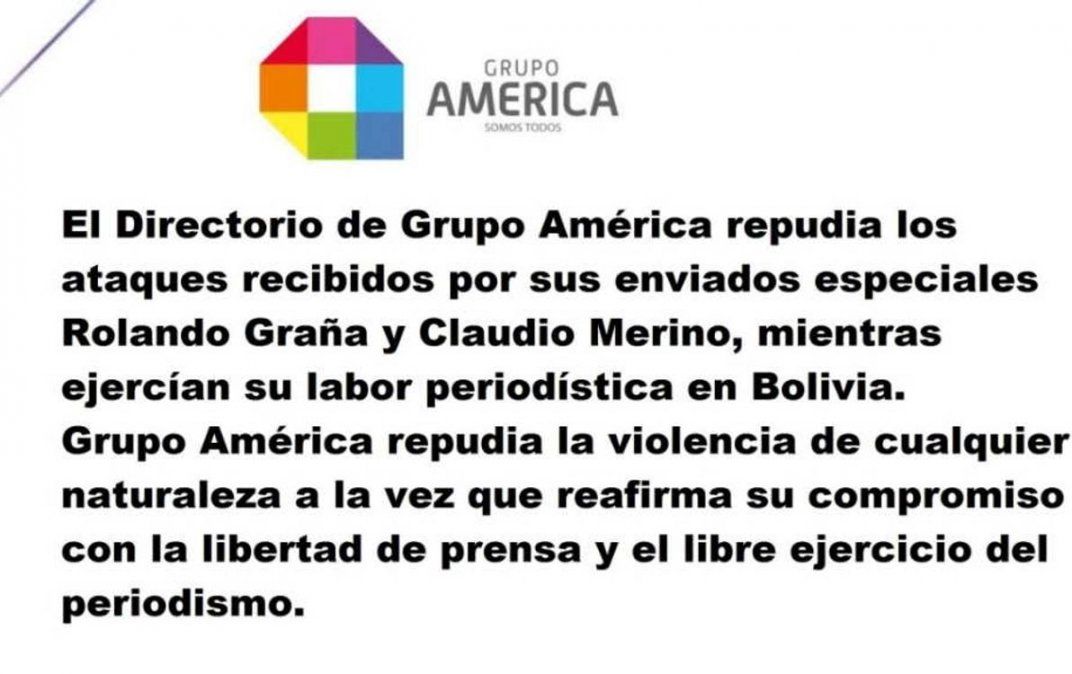 El Directorio del Grupo sostuvo: "El Grupo América repudia los ataques recibidos por sus enviados especiales Rolando Graña y Claudio Merino, mientras ejercían su labor periodística en Bolivia".