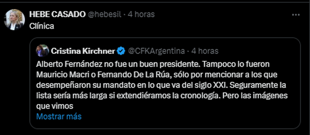 En su perfil de X, Hebe Casado retuiteó el mensaje de Cristina Fernández bajo la inscripción de "cínica".