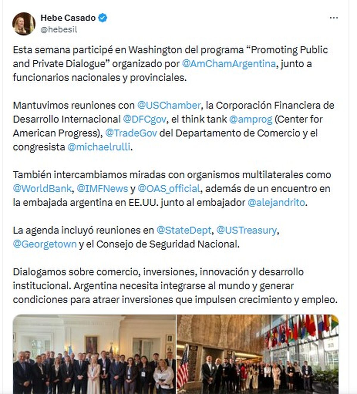 Hebe Casado cerró una semana clave en Washington con foco en inversiones y vínculos estratégicos con EE.UU.