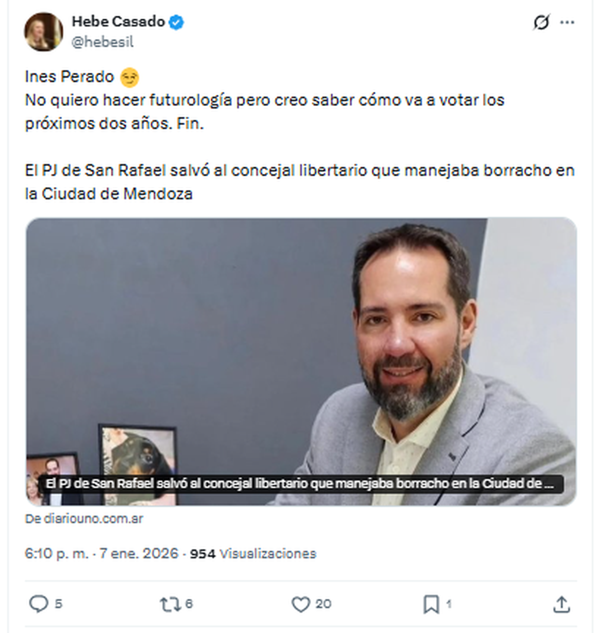 Luego de que Diario UNO contara que el bloque peronista frenó la causa de expulsión para Antolín que había pedido Cambia Mendoza y esa votación terminó 7 a 5, con el voto del mismo Antolín que votó a favor suyo, Casado posteó en sus redes esa nota. Y remarcó: "No quiero hacer futurología pero creo saber cómo va a votar los próximos dos años. Fin", en referencia a la cercanía política de Antolín con el PJ que lo salvó.