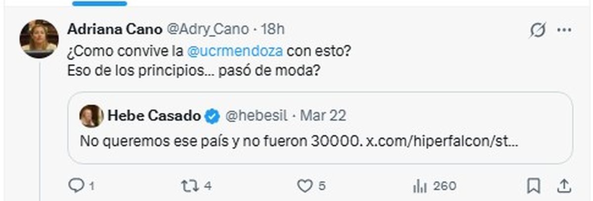 Otra que salió a cuestionar a Casado fue la presidenta del bloque del PJ en el Senado de Mendoza, Adriana Cano.