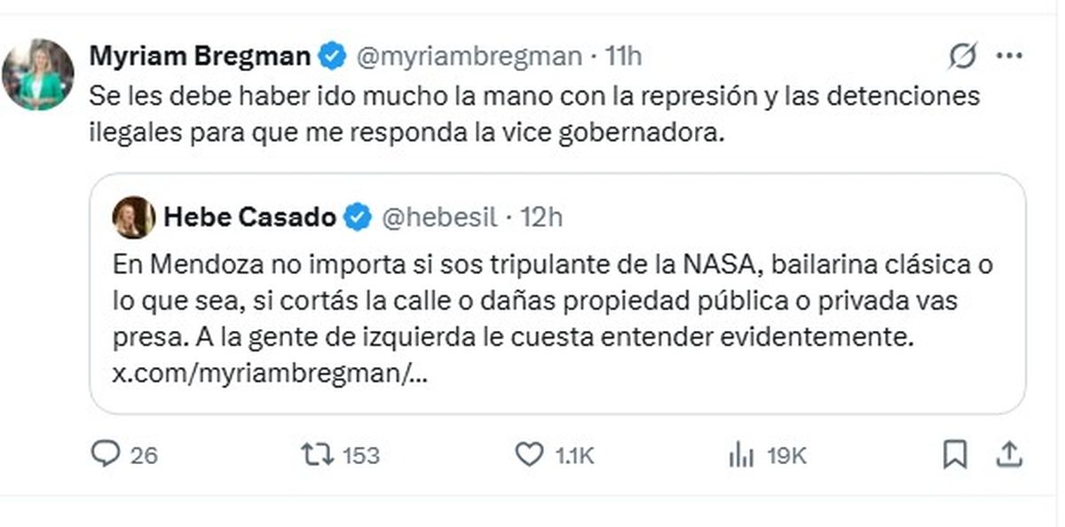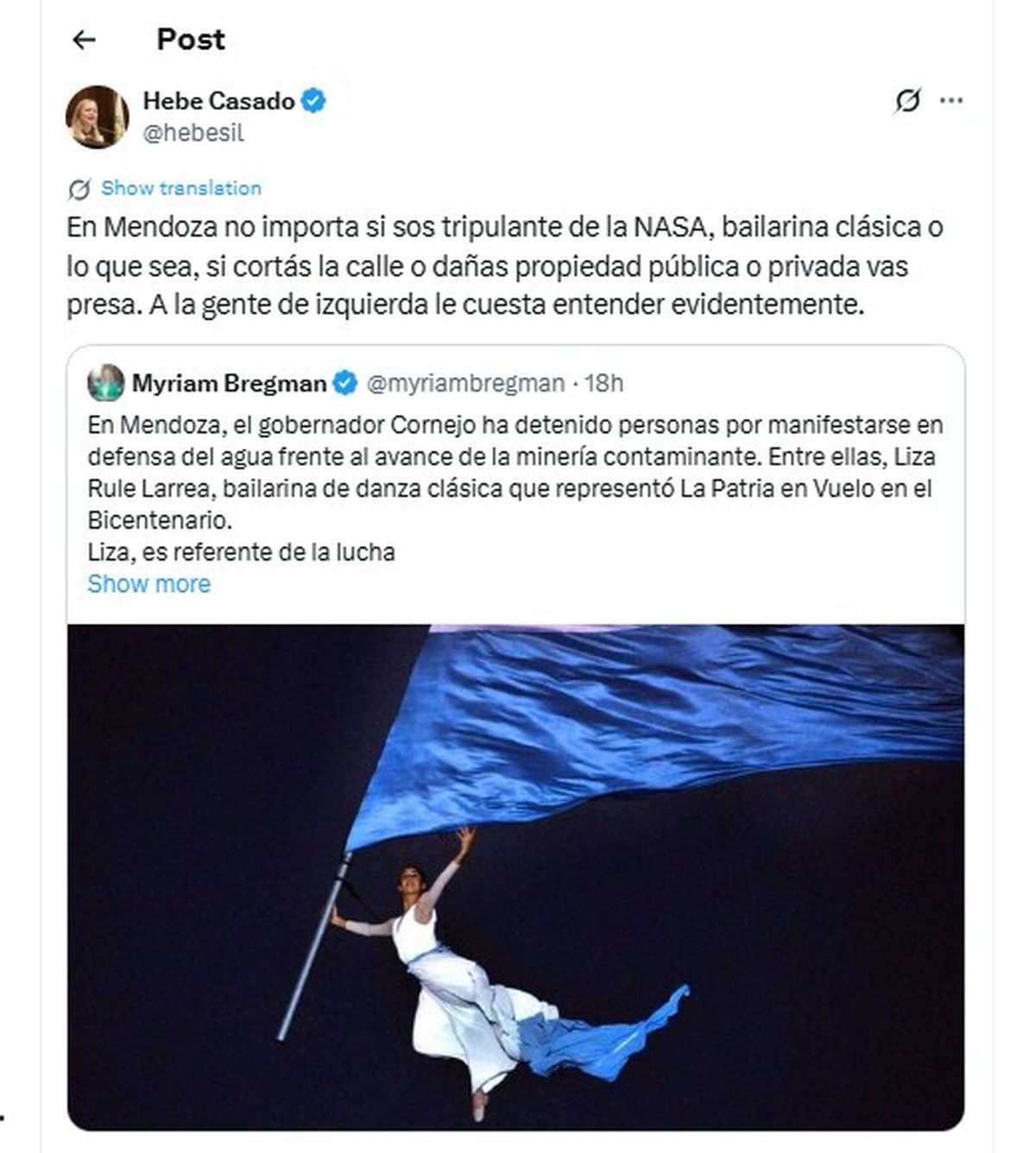 Hebe Casado no tardó en responder: "En Mendoza no importa si sos tripulante de la NASA, bailarina clásica o lo que sea, si cortás la calle o dañás propiedad pública o privada vas presa. A la gente de izquierda le cuesta entender evidentemente".