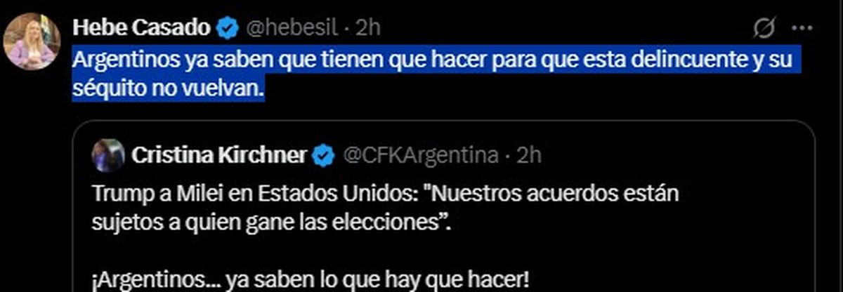 Un mensaje de Cristina Kirchner este martes provocó una breve y fuerte respuesta de Hebe Casado poco después de que el presidente de Estados Unidos Donald Trump anunciara su respaldo a Javier Milei, sujeto al resultado de las elecciones.