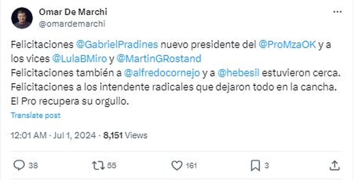 Pese a su afirmación, del otro lado, Omar De Marchi no sólo se sumó al festejo de Pradines en Luján, sino que también llevó su alegría y su picardía a las redes sociales y poco después de que se confirmara el triunfo de su alfil político salió a "consolar" a Hebe Casado y al mismo Alfredo Cornejo.