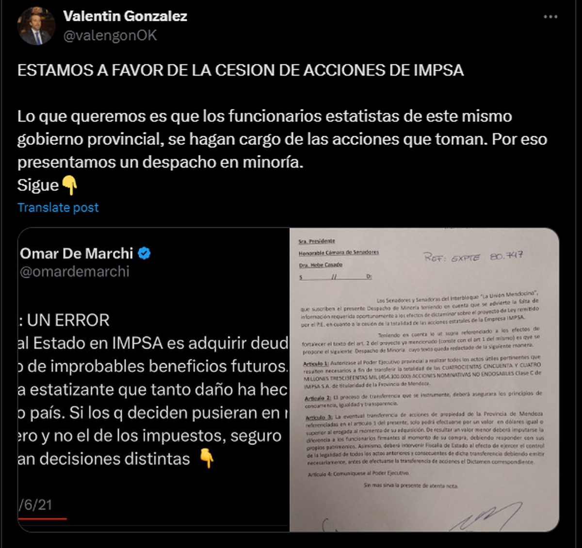 Los tres le respondieron que nunca el demarchismo ha estado en contra de las privatizaciones, sino justamente lo contrario: de haber estatizado la empresa para después venderla. En medio, según manifestó Valentín González, quedó el monto de 5 millones de dólares que el entonces gobierno de Alberto Fernández envió a la Provincia para comprar las acciones de IMPSA. "Recuperemos este dinero para la provincia", insistió González.