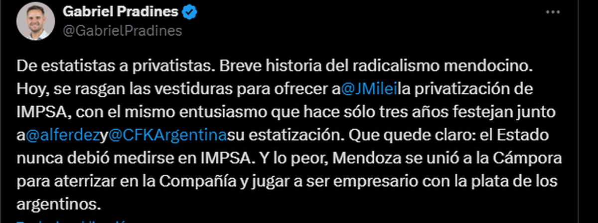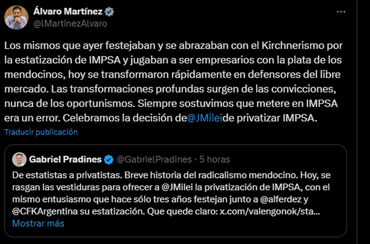 Otro que le respondió a Casado fue Pradines. El joven dirigente del PRO señaló: Breve historia del radicalismo mendocino, de estatistas a privatistas. Hoy, se rasgan las vestiduras para ofrendar a Javier Milei la privatización de IMPSA, con el mismo entusiasmo que hace sólo tres años festejan junto al Gobierno de Alberto Fernández y Cristina Kirchner su estatización".