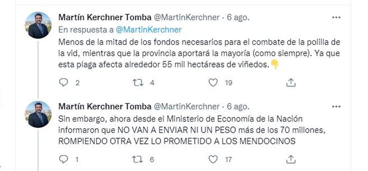 En su reclamo, Kerchner le apuntó a Hinojosa y disparó que "sería importante que deje de hacer campaña y se ocupe de los deberes de su cargo", a lo que Hinojosa respondió invitándolo a sumarse al trabajo que viene haciendo con distintas entidades vitivinícolas para acercar herramientas para el sector y acotó que lo que menos se necesita es quedarse en la crítica.