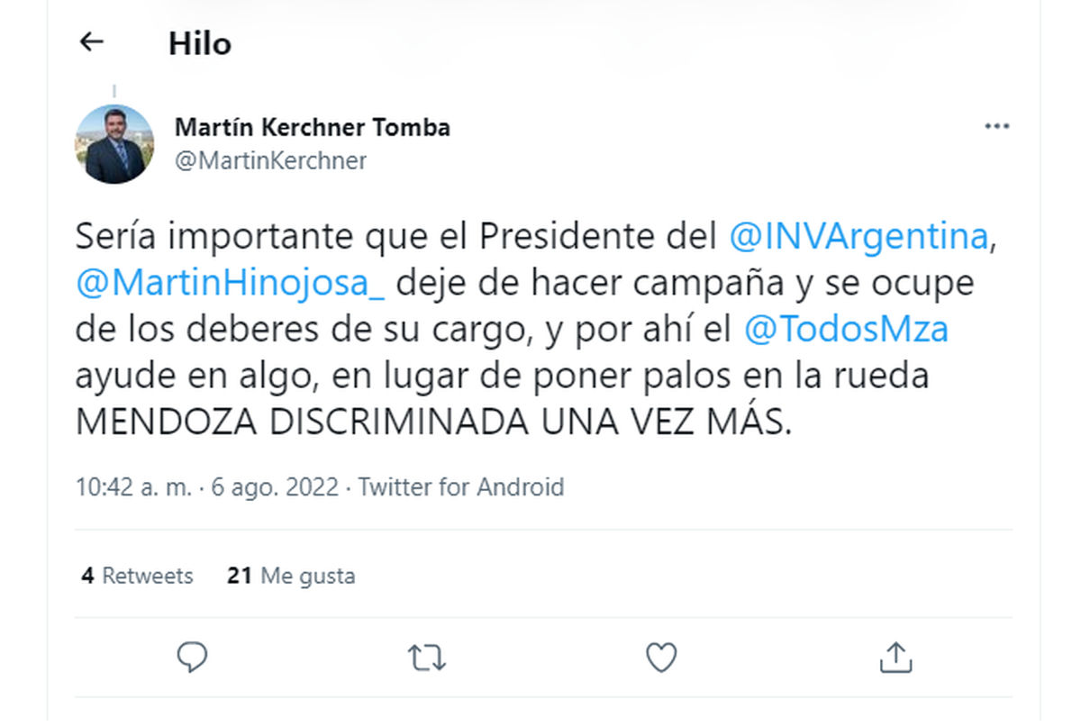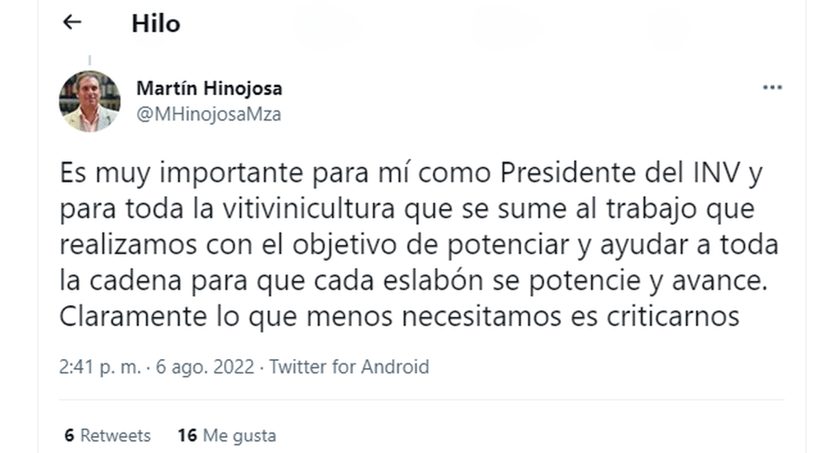 Él escribió: "Estimado Martín Kerchner, un gusto conocerlo. Le cuento que desde el INV y con todo el equipo venimos trabajando día a día con las entidades vitivinícolas del país con el objetivo de acercar herramientas y fondos para el sector, el cual necesita que trabajemos juntos"