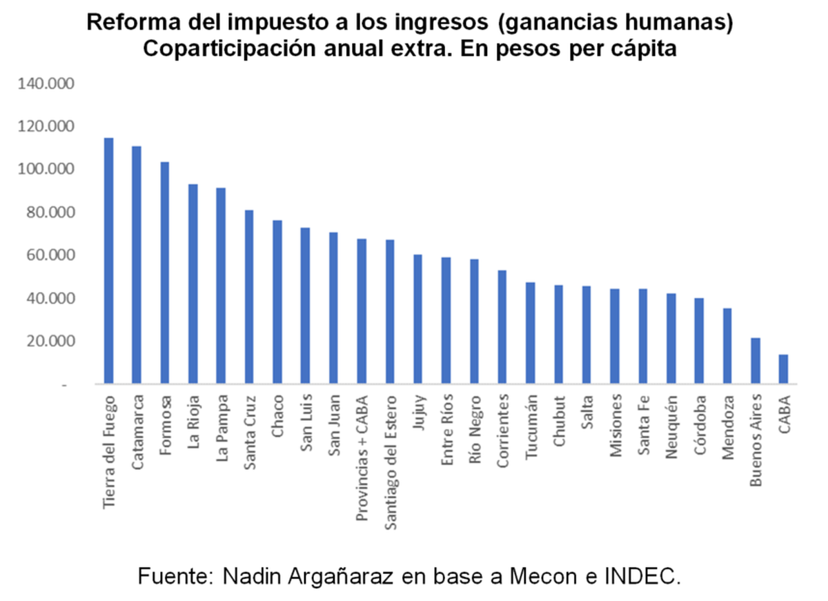 Por ejemplo, dice el economista, "si se toma el caso de Catamarca, el gobierno provincial va a recibir un monto anual por habitante de $110.000, cifra que resulta de la combinación de un ingreso extra de $47.500 millones y una población de 429.500 habitantes. Esta cantidad de dinero es mucho mayor al aporte que van a hacer los catamarqueños a los que les toque pagar un mayor impuesto a las ganancias a partir de la reforma".