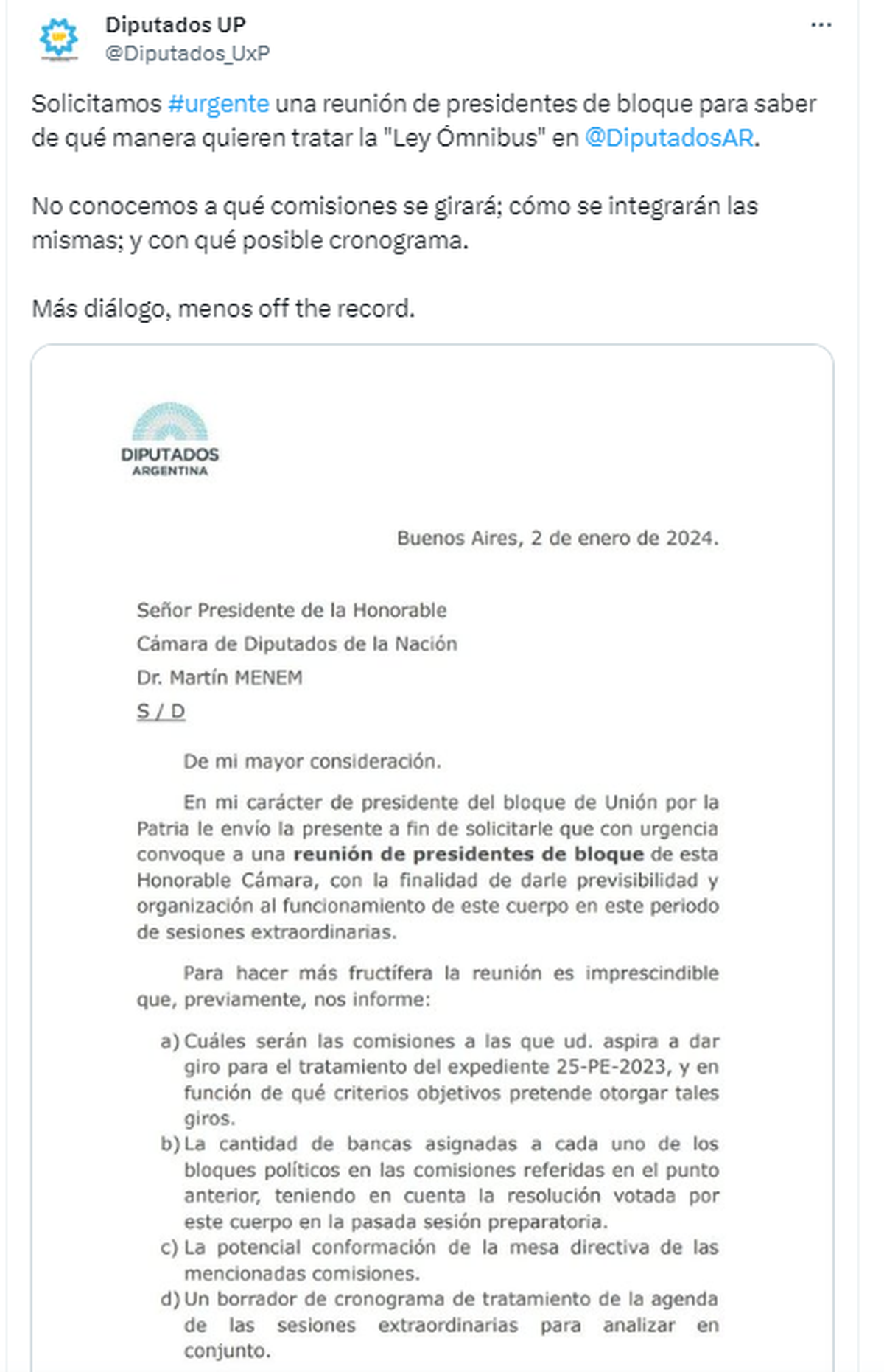 Ante la incertidumbre que reina sobretodo en la Cámara de Diputados de la Nación, el presidente del bloque de Unión por la Patria, Germán Martínez envió una dura carta a Martín Menem solicitándole con urgencia que convocara a los presidentes de bloque para organizar las sesiones extraordinarias y saber a qué comisiones pretendía enviar aquella megaley.