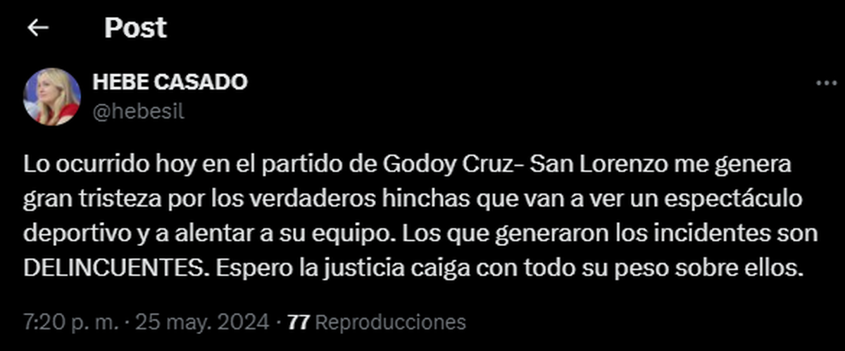 Casado posteó: "Lo ocurrido hoy en el partido de Godoy Cruz- San Lorenzo me genera gran tristeza por los verdaderos hinchas que van a ver un espectáculo deportivo y a alentar a su equipo. Los que generaron los incidentes son DELINCUENTES. Espero que la justicia caiga con todo su peso sobre ellos".