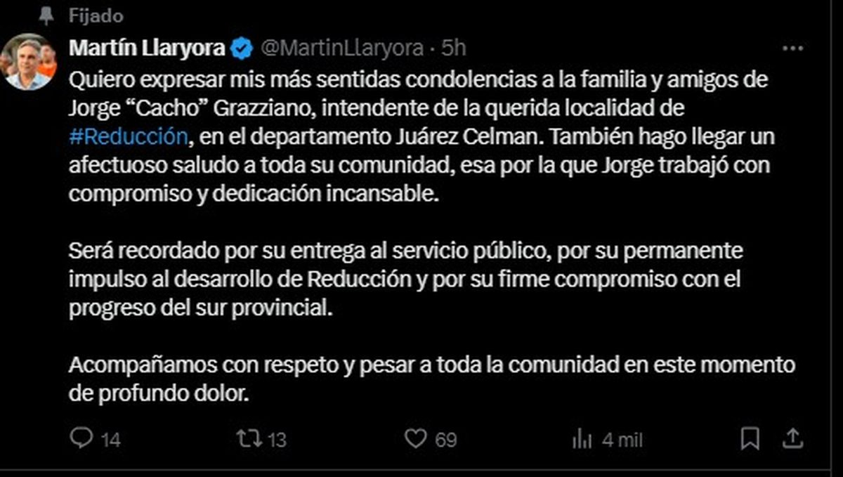 El gobernador Martín Llaryora manifestó su sentido pésame por la tragedia en sus redes sociales: “Quiero hacer llegar mis condolencias más sinceras a la familia, amistades y vecino de Jorge Cacho Grazziano, quien será recordado por su incansable labor al frente del municipio”.