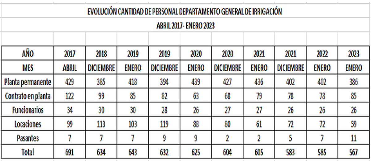Precisamente, anticipándose a un contexto económico cada vez más negativo y los efectos del cambio climático y la sequía (que obligan a una gestión más eficiente del agua), Irrigación ha bajado el número de empleados año a año, ha congelado los sueldos de los funcionarios (que son los mínimos que pueden haber) y al inicio de este 2023 no otorgó el bono que dio la Provincia.