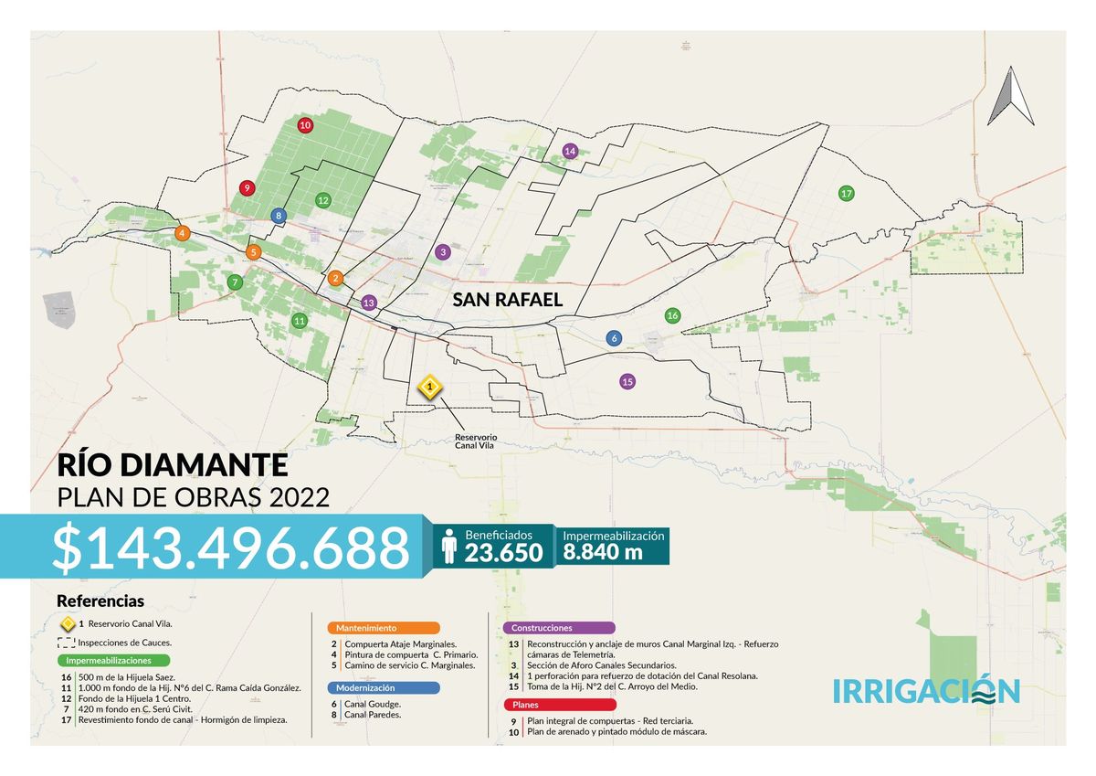 - En la cuenca del río Diamante, en San Rafael, se ejecutan 18 proyectos hídricos sobre las redes primarias, secundarias y terciarias. Son casi nueve kilómetros de cauces impermeabilizados y la inversión asciende a $143,4 millones. Para tener una perspectiva que a veces resulta difícil de adquirir desde la Ciudad: sólo con las obras en la red terciaria, que mejorarán la distribución, se beneficia una superficie de 3.725 hectáreas, alcanzando a 2.061 usuarios.