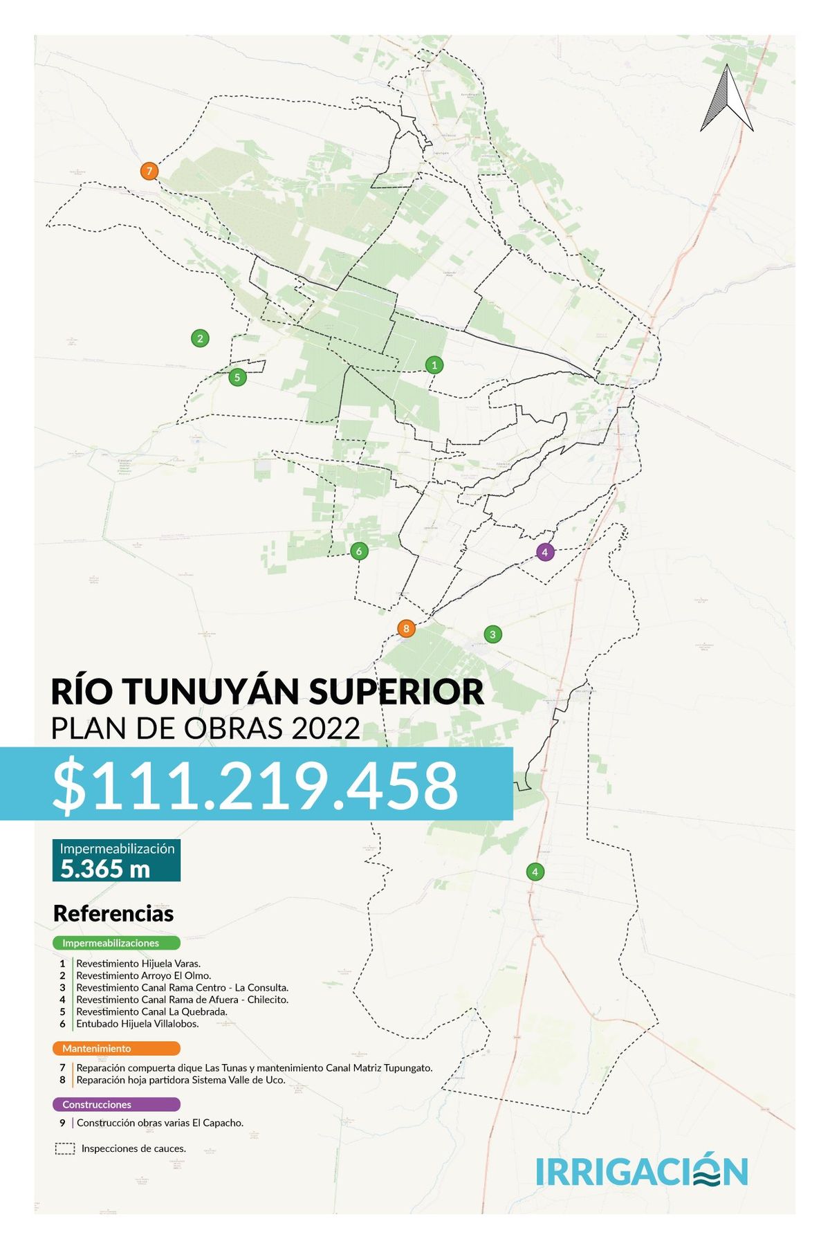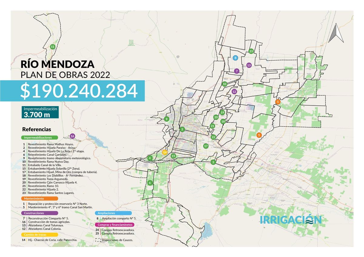 En las últimas semanas, el Departamento General de Irrigación difundió el estado de distintas obras en los departamentos mendocinos, como parte de un plan anual que tiene un presupuesto de $986 millones y cuenta entre sus metas principales evitar que el agua -el bien más preciado de la provincia- no se pierda en su trayecto por los cauces.