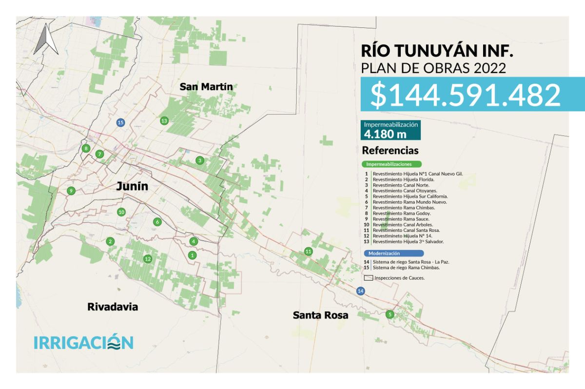 - En el Tunuyán inferior hay una serie de 15 obras que, en total, implican $144,5 millones de pesos. Serán 4.180 metros de canales impermeabilizados los que sumará esta zona, que tiene un marcado perfil productivo.