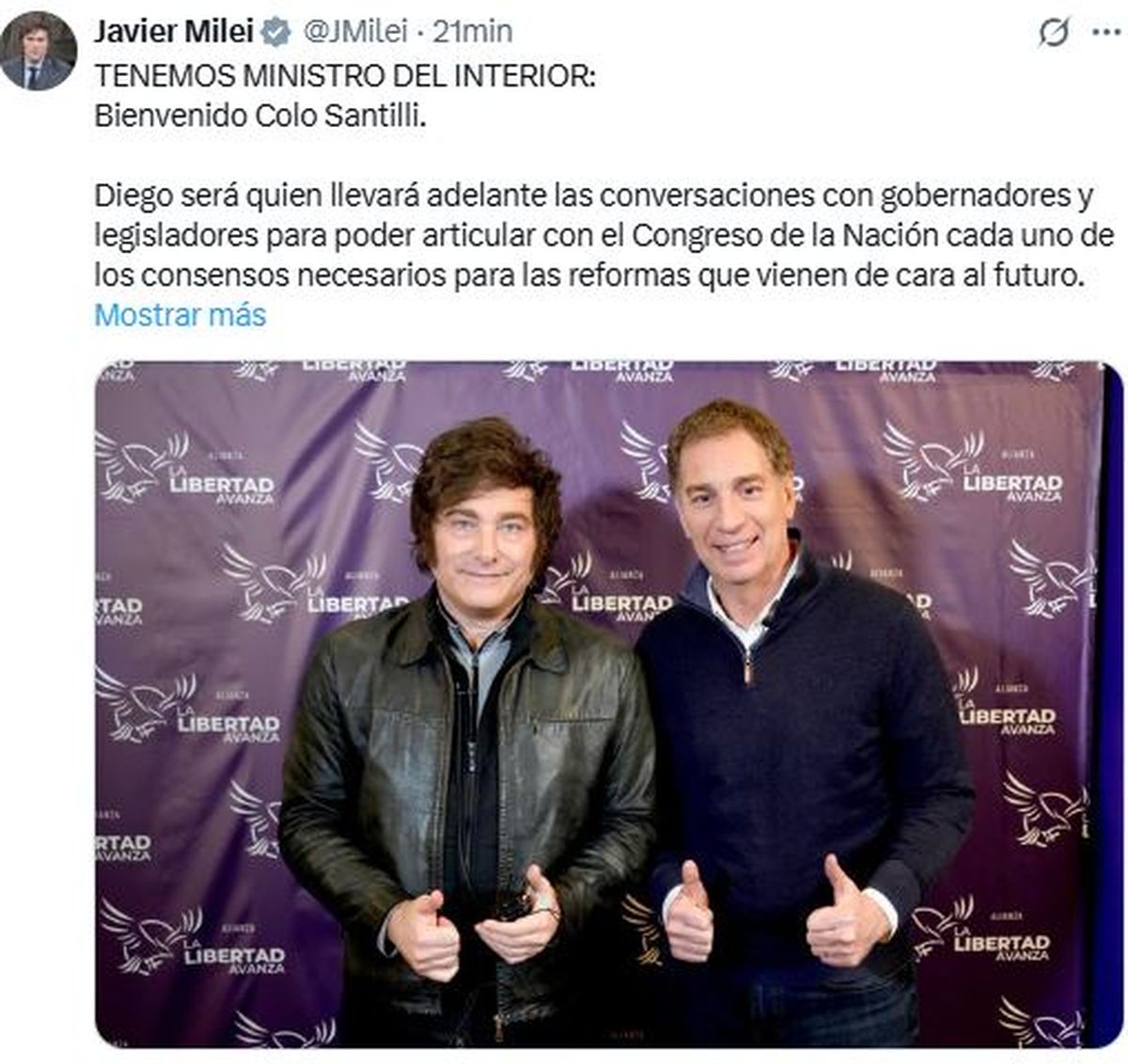El presidente Javier Milei anunció este domingo que Diego Santilli será el nuevo ministro del Interior. El nombramiento fue confirmado a través de las redes sociales oficiales del mandatario.