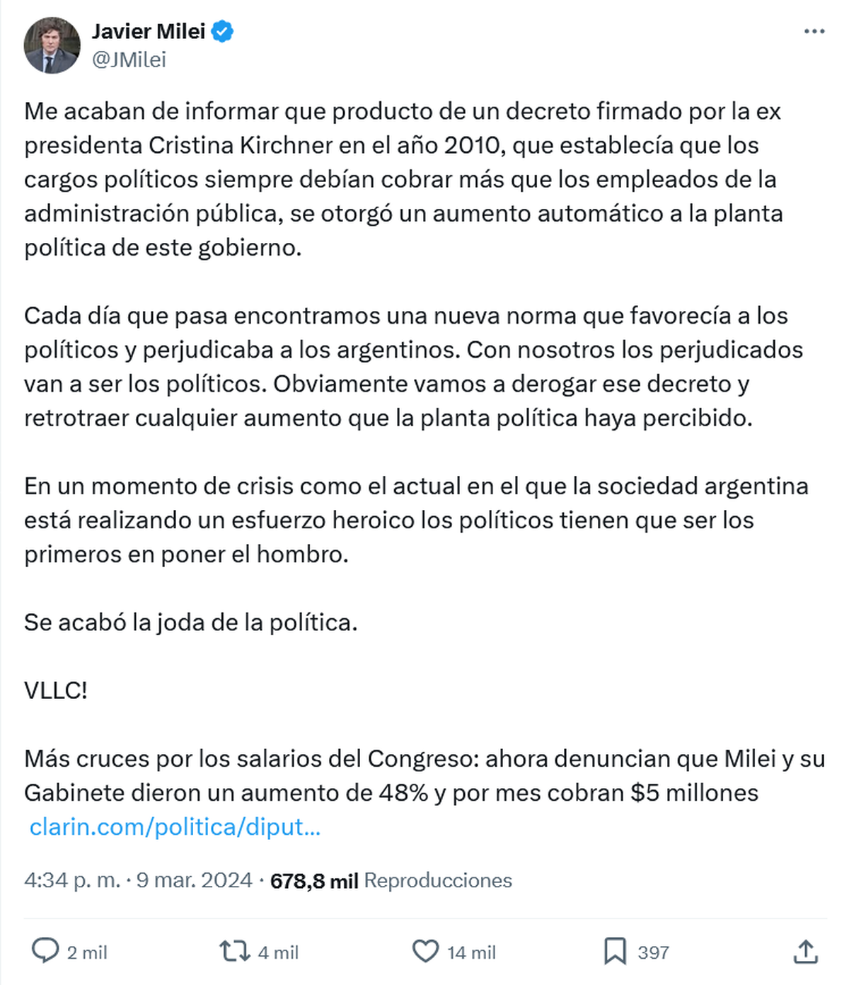 Tras la denuncia pública de peronistas y piqueteros de que el Presidente Javier Milei había aumentado su propio sueldo y los de todo sus funcionarios del Poder Ejecutivo, el primer mandatario nacional tuiteó este sábado que dejará sin efecto "ese decreto del año 2010 que, firmado por Cristina Fernández, habilitó los aumentos automáticos".