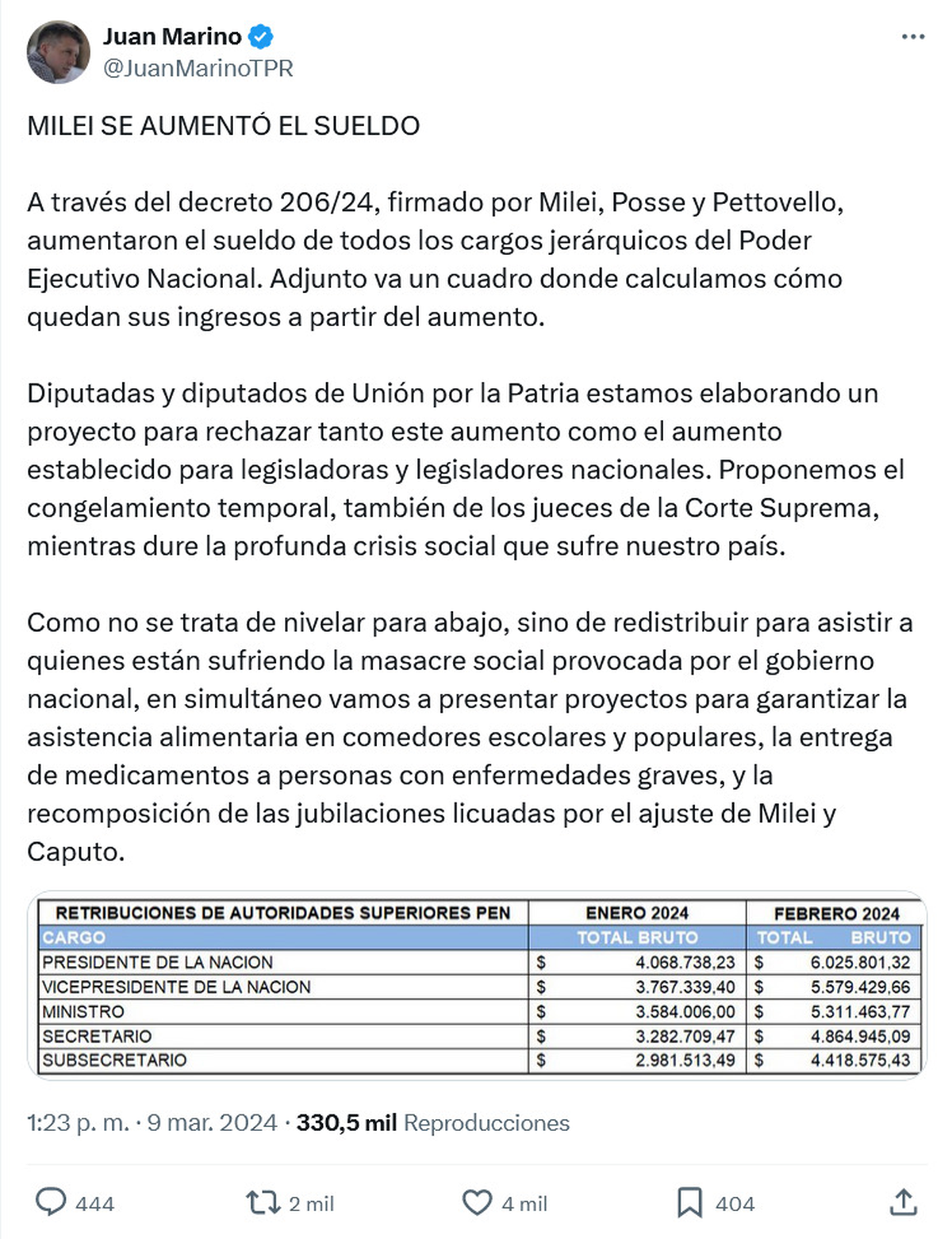 Más tarde, el piquetero Juan Marino posteó en la red social X (ex Twitter) que el Presidente avaló las subas salariales mediante el decreto 206 de 2024 y mostró cifras que dan cuenta de que Milei pasaría a cobrar poco más de $6 millones mensuales, dejando atrás los $4 millones cobrados en febrero.