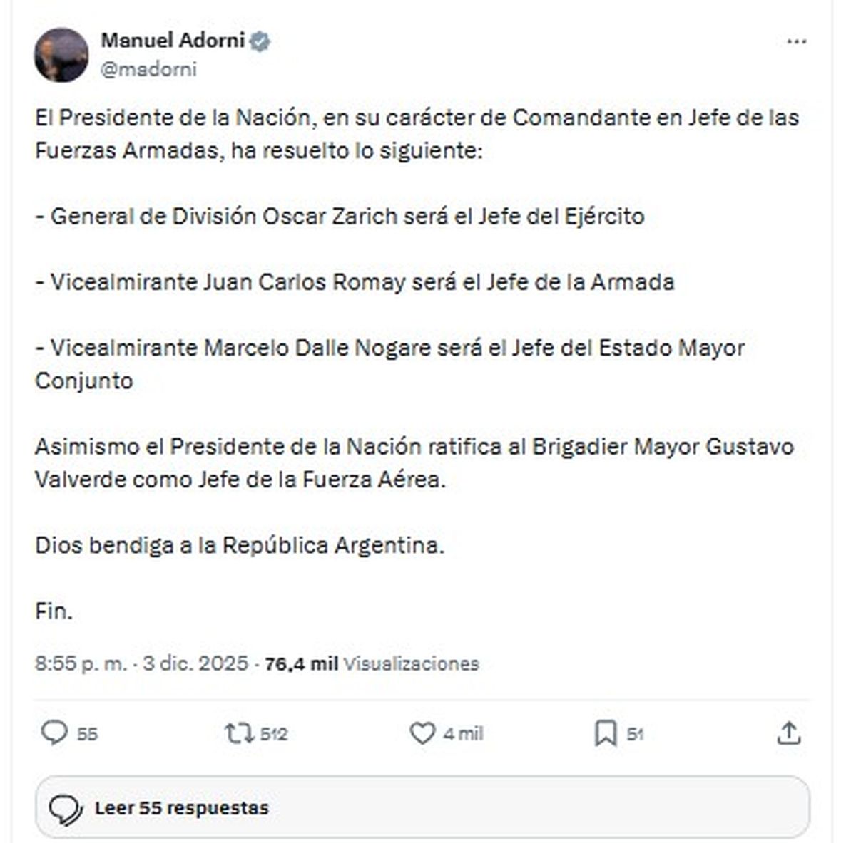 “El Presidente de la Nación, en su carácter de Comandante en Jefe de las Fuerzas Armadas, ha resuelto lo siguiente”, señaló Adorni en su comunicado, donde también concluyó con la expresión: “Dios bendiga a la República Argentina”.