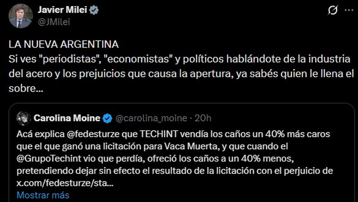 A través de su cuenta en la red social X, Javier Milei apuntó contra sectores del periodismo, la política y la economía que criticaron la decisión oficial. “La nueva Argentina. Si ves ‘periodistas’, ‘economistas’ y políticos hablándote de la industria del acero y los prejuicios que causa la apertura, ya sabés quién les llena el sobre”, escribió el mandatario.