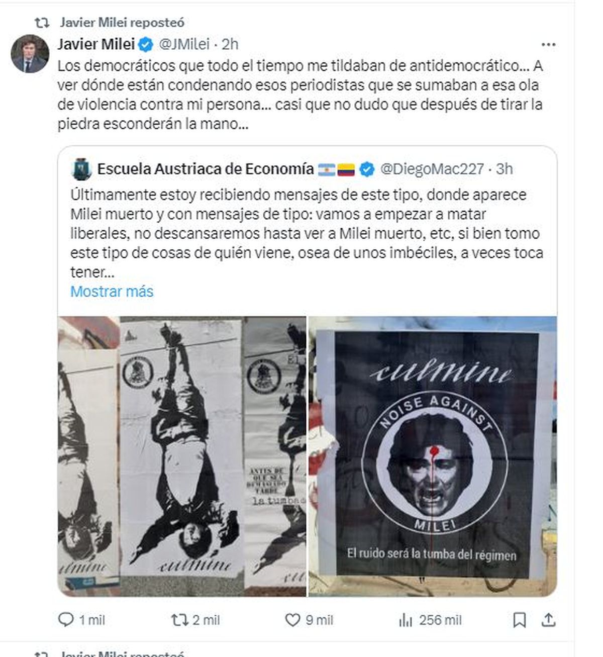 Todo esto se dio por un posteo de la cuenta "Escuela Austriaca de Economía", que denunciaba recibir "mensajes de este tipo, donde aparece Milei muerto". Asimismo, había mensajes como "vamos a matar liberales, no descansaremos hasta ver a Milei muerto", entre otros. "Si bien tomo este tipo de cosas de quien viene, o sea de unos imbéciles, a veces toca tener cierto reparo", señaló esa cuenta.
