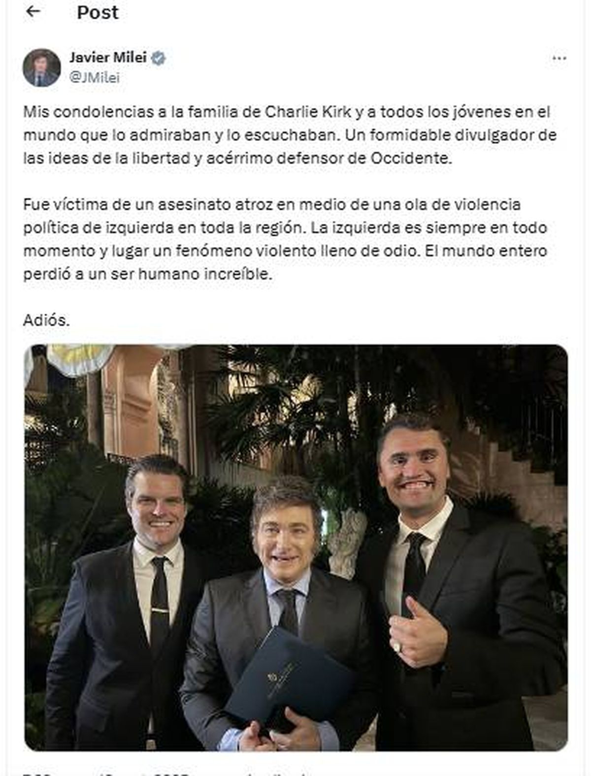 El presidente Milei posteó: "Mis condolencias a la familia de Charlie Kirk y a todos los jóvenes en el mundo que lo admiraban y lo escuchaban. Un formidable divulgador de las ideas de la libertad y acérrimo defensor de Occidente. Fue víctima de un asesinato atroz en medio de una ola de violencia política de izquierda en toda la región. La izquierda es siempre en todo momento y lugar un fenómeno violento lleno de odio. El mundo entero perdió a un ser humano increíble. Adiós".
