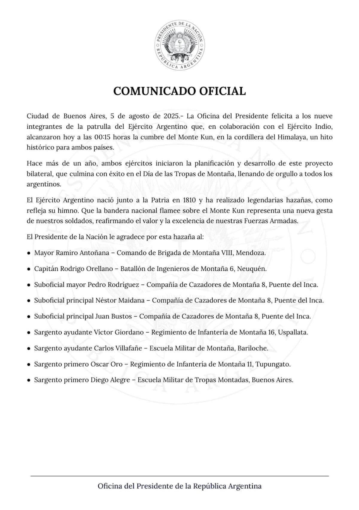 El comunicado oficial de Presidencia resaltó que ambas patrullas iniciaron la planificación del proyecto hace más de un año y rescató que lograron la cumbre el día de las Tropas de Montaña "llenando de orgullo a todos los argentinos".