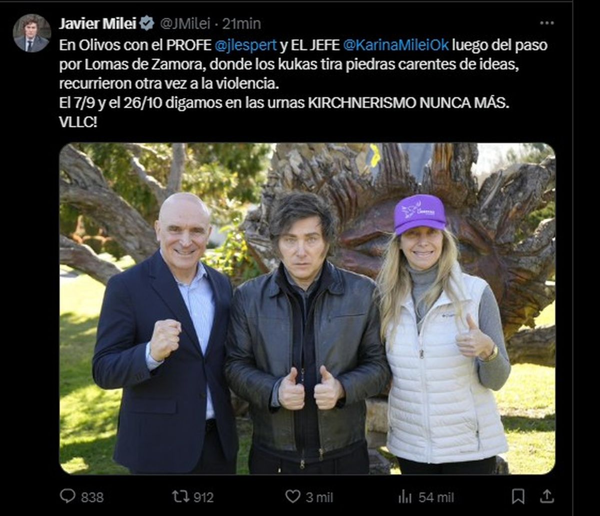 El mandatario posteó desde la Quinta de Olivos, donde se encontraba junto a su hermana y secretaria General, Karina Milei, y el diputado José Luis Espert, ambos presentes durante los incidentes en el acto de campaña.