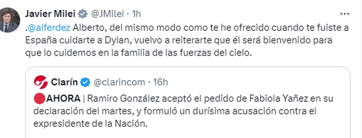 "Alberto, del mismo modo como te he ofrecido cuando te fuiste a España cuidarte a Dylan, vuelvo a reiterarte que él será bienvenido para que lo cuidemos en la familia de las fuerzas del cielo", expresó Milei para invitar a la mascota del expresidente a vivir en la Quinta de Olivos junto a sus perros.