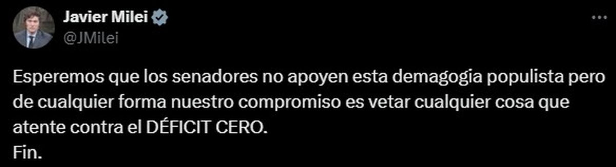 "Esperemos que los senadores no apoyen esta demagogia populista pero de cualquier forma nuestro compromiso es vetar cualquier cosa que atente contra el DÉFICIT CERO. Fin.", escribió Javier Milei en su cuenta de X (ex Twitter).