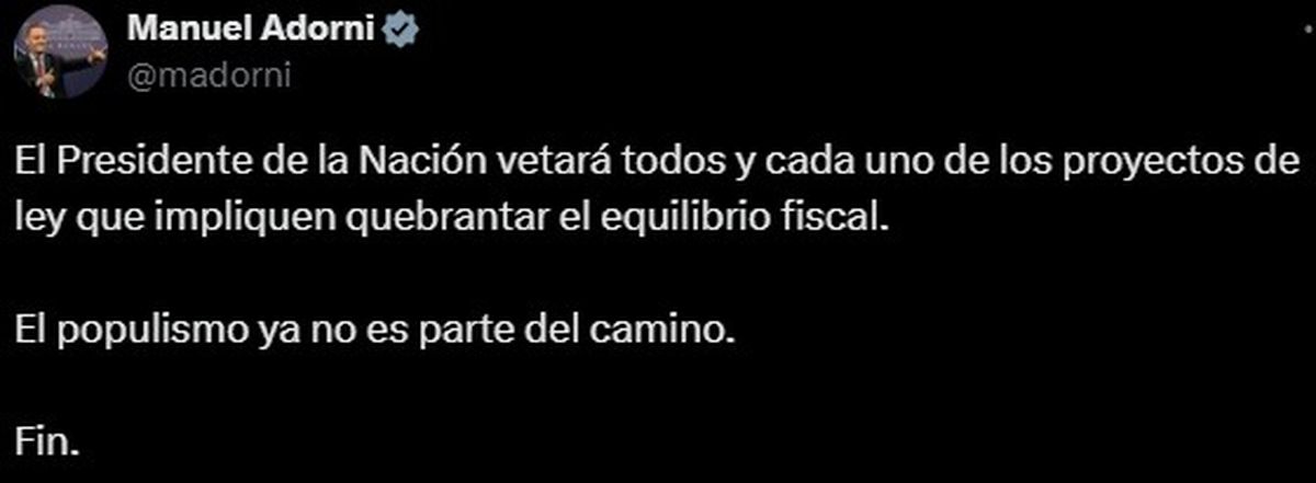 "El Presidente de la Nación vetará todos y cada uno de los proyectos de ley que impliquen quebrantar el equilibrio fiscal. El populismo ya no es parte del camino. Fin", precisó Adorni en X.