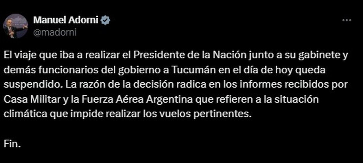 "El viaje que iba a realizar el Presidente de la Nación junto a su gabinete y demás funcionarios del gobierno a Tucumán en el día de hoy (martes) queda suspendido. La razón de la decisión radica en los informes recibidos por Casa Militar y la Fuerza Aérea Argentina que refieren a la situación climática que impide realizar los vuelos pertinentes", informó oficialmente el vocero presidencial Manuel Adorni.