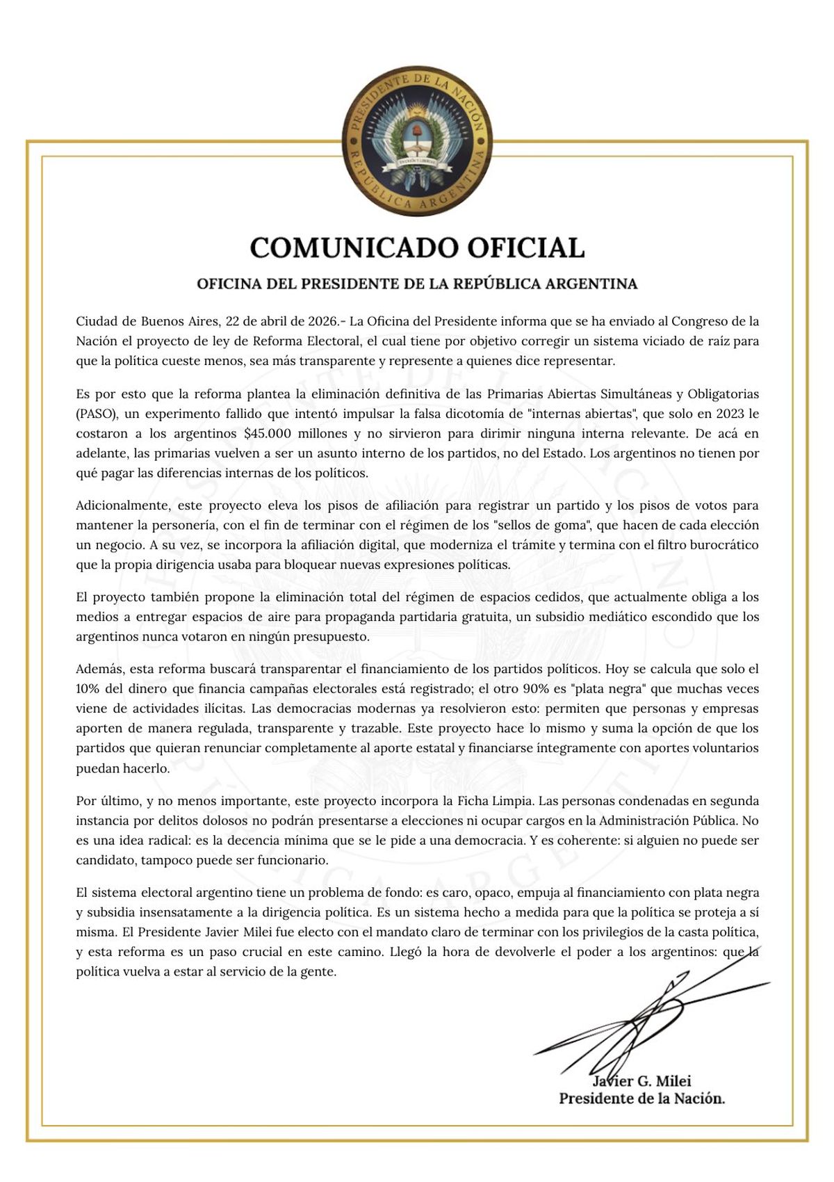 Tal como lo anunció en redes sociales el martes, mientras permanecía en Israel, Javier Milei envió este miércoles el proyecto de reforma electoral al Senado. En principio, no tiene los votos para poder anular las elecciones PASO para definir los candidatos electivos al Congreso y a la presidencia, reconocieron fuentes parlamentarias a la agencia Noticias Argentinas.