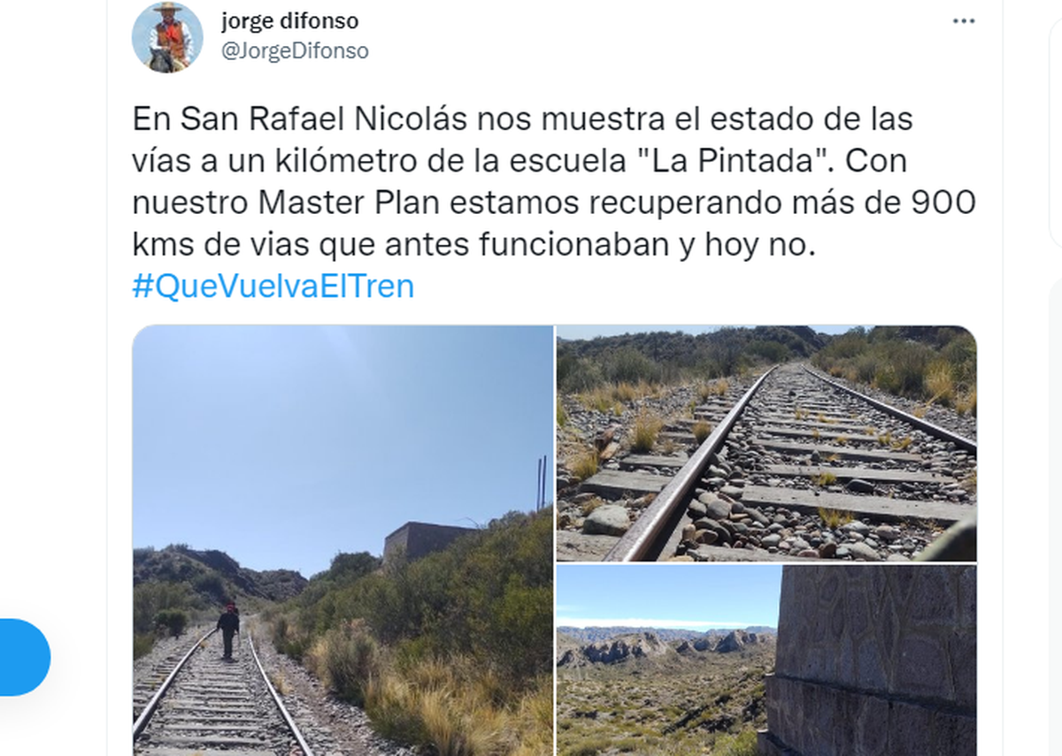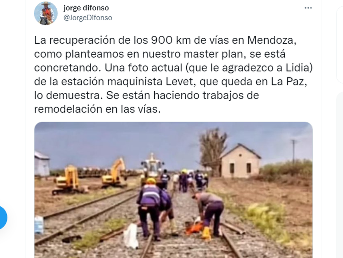 El sancarlino Jorge Difonso, coautor del master plan que busca recuperar 900 kilómetros de vías de Mendoza y refuncionalizar el servicio del tren de pasajeros en Mendoza -de carga y pasajeros- como herramienta de desarrollo, publicó vía Twitter que desde la empresa Trenes Argentinos ya se realizan estudios y trabajos en las vías en la zona de La Paz y el Sur.
