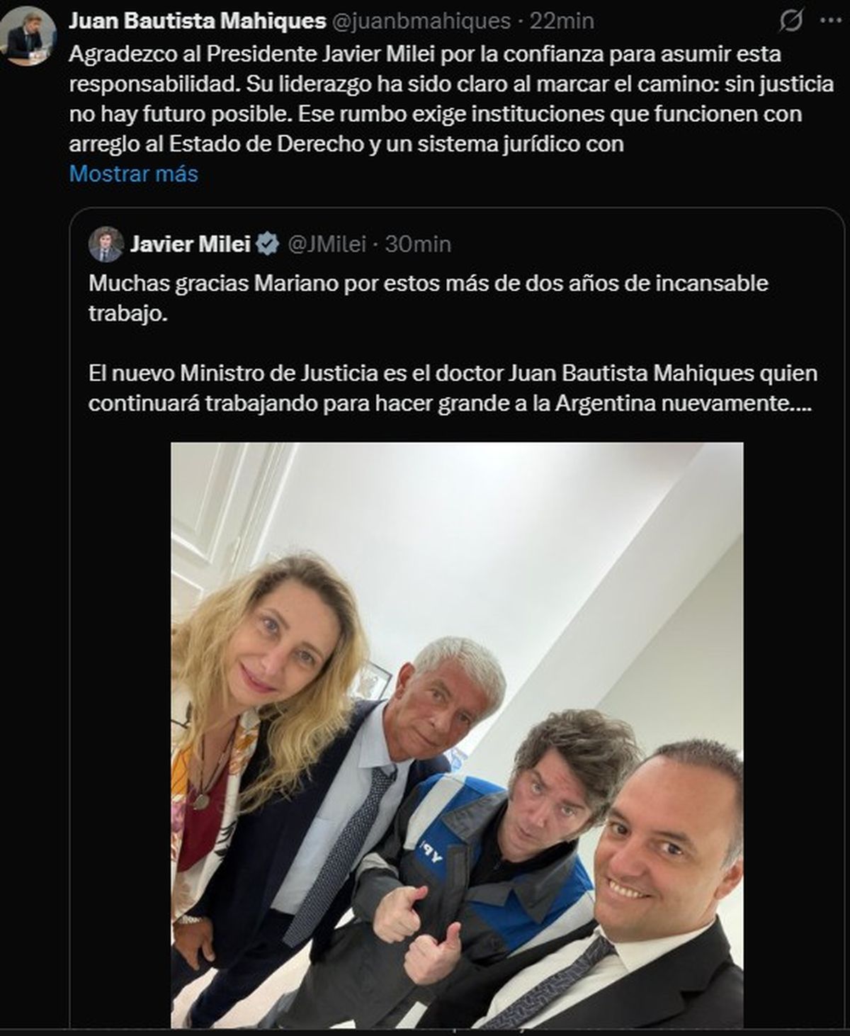 Tras una jornada marcada por reuniones y hermetismo, Javier Milei oficializó la salida del Gabinete de Mariano Cúneo Libarona. El Presidente también dio a conocer que el nuevo titular del Ministerio de Justicia se Juan Bautista Mahiques, hasta hoy Fiscal General de la Ciudad de Buenos Aires.