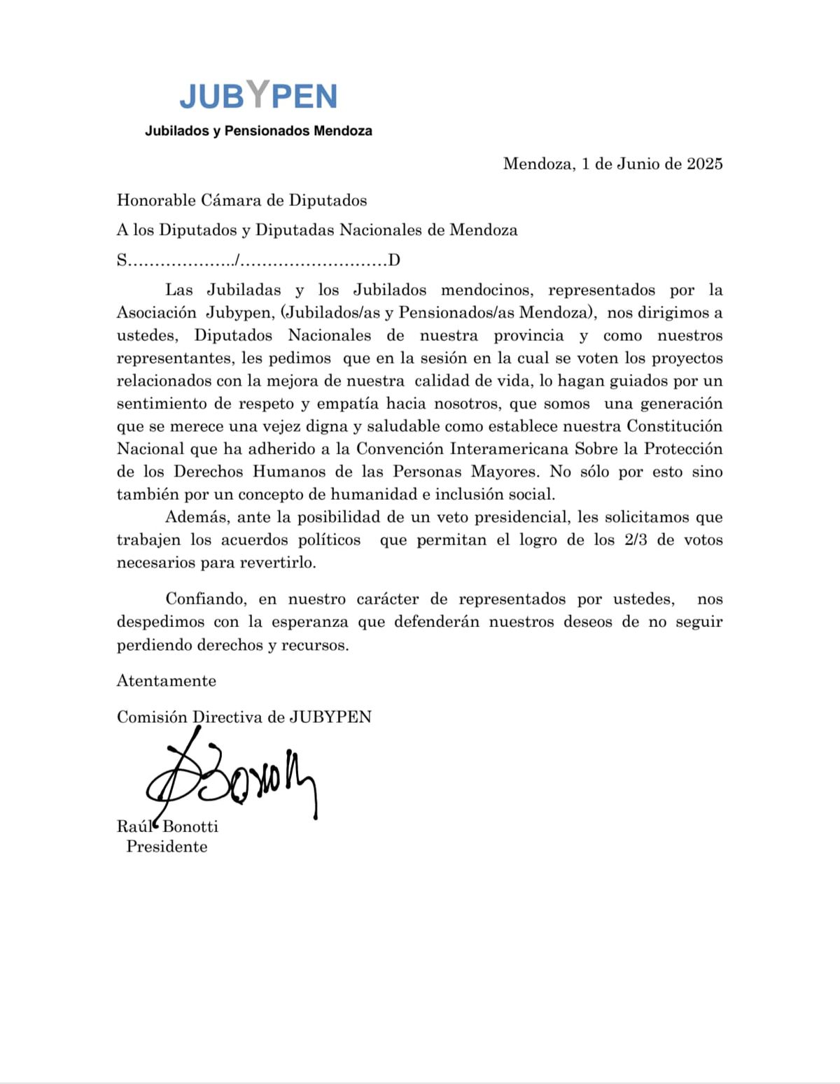 Jubypen (Jubilados y Pensionados de Mendoza), agrupación que preside Raúl Bonotti, fue quien decidió mandarles las misivas a los legisladores nacionales que representan a distintos espacios de Mendoza.